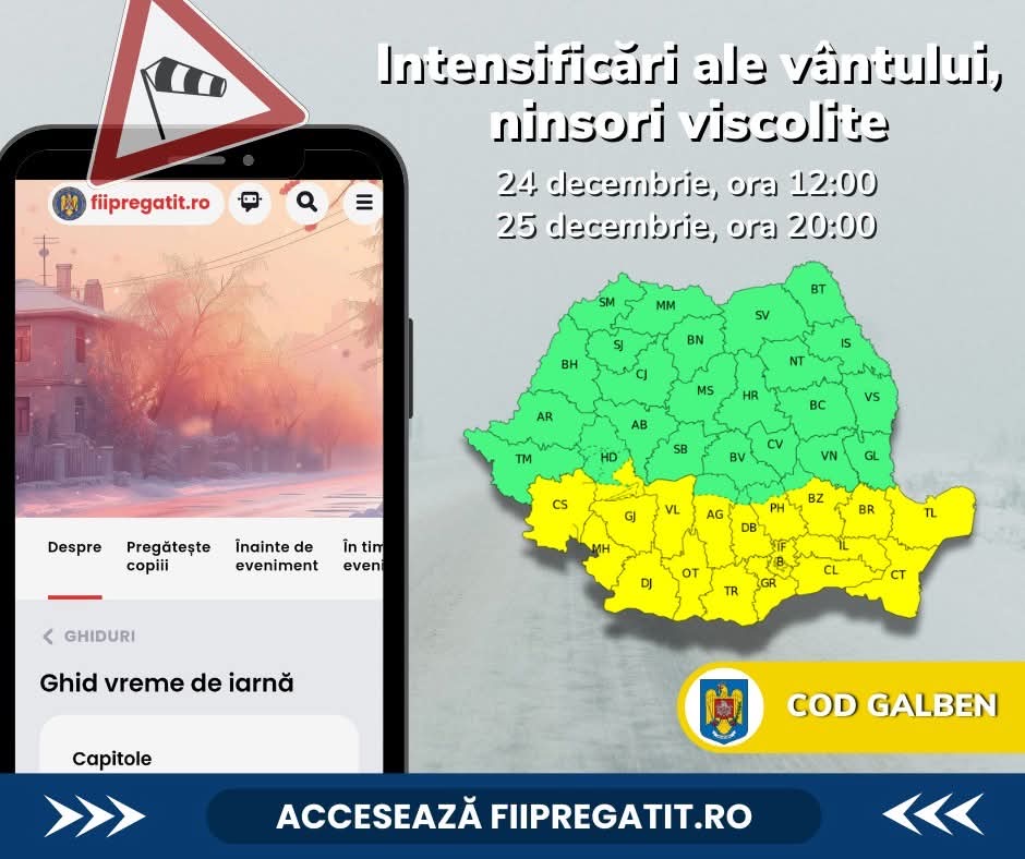 Inspectoratul pentru Situații de Urgență "A.D. Ghica" al județului Teleorman recomandă cetățenilor să adopte un comportament preventiv datorită intensificărilor vântului, ninsorilor viscolite și răcirii accentuate a vremii în intervalul 23 decembrie, ora 18, până pe 26 decembrie, ora 10. ISU Teleorman subliniază importanța respectării unor măsuri specifice pentru limitarea efectelor fenomenelor meteorologice periculoase.
