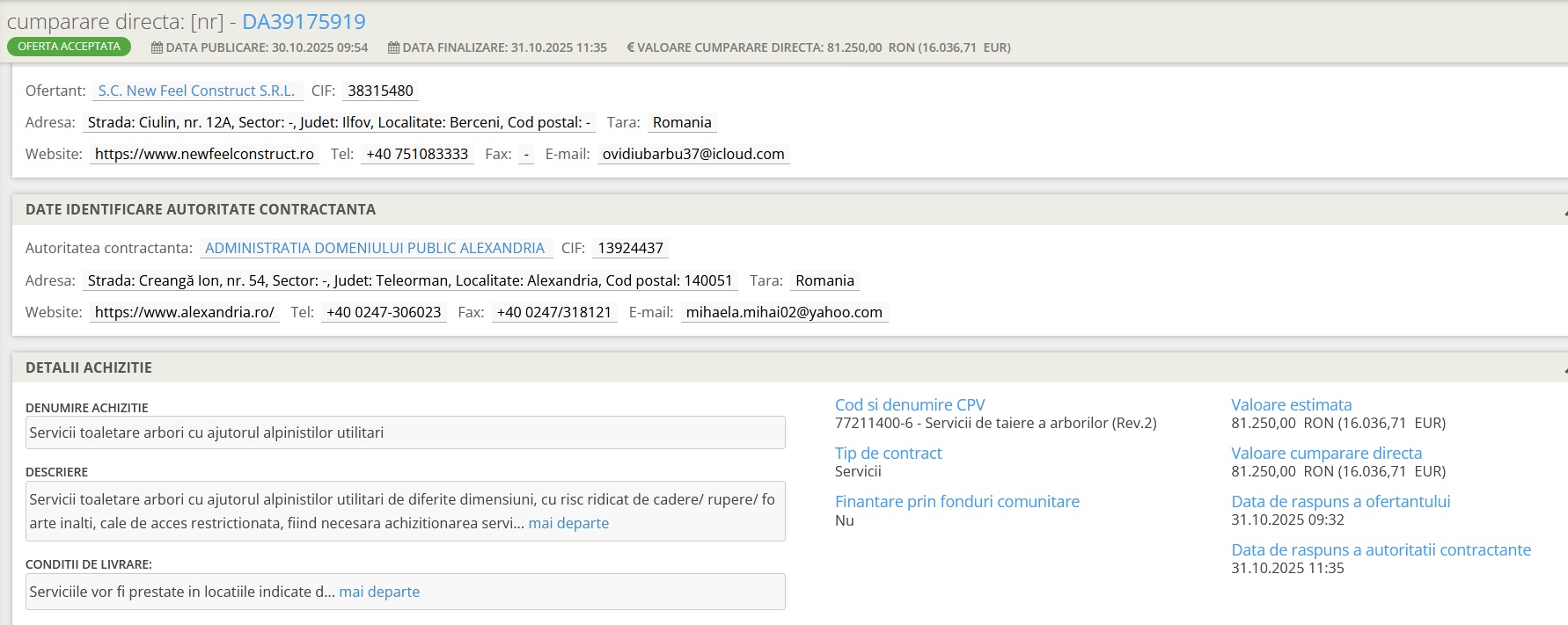 Conform datelor din Sistemul Electronic de Achiziții Publice, intervenția va viza 625 de arbori, iar oferta firmei câștigătoare include toate cheltuielile necesare pentru prestația serviciilor de toaletare, care vor fi efectuate în condiții specializate pentru siguranța lucrătorilor.